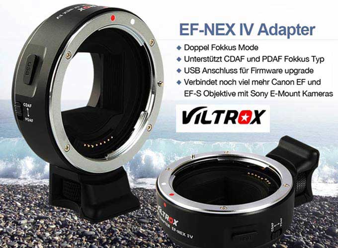 Ab sofort lieferbar: Viltrox EF-NEX IV. Der Adapter ermöglicht es Canon EF oder EF-S Objektive an Sony Kameras mit E-Mount einzusetzen. Dabei bleiben alle Funktionen erhalten, sowie der Autofokus als auch die Rückmeldung der Blende und Distanz an die Kamera. Neu werden jetzt auch die Auto-Fokus-Funktionen PDAF und CDAF unterstützt. Eine USB Steckbuchse ermöglicht zudem den Adapter auf künftige Veränderungen in den AF-Protokollen über ein Firmware Upgrade aufzurüsten.