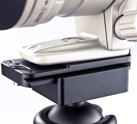 Die Schnellwechselplatte KF-75 lässt sich am Stativfuss grosser Teleobjektive befestigen und er möglich so, das schnelle und sichere auf- und abmontieren am Stativ.